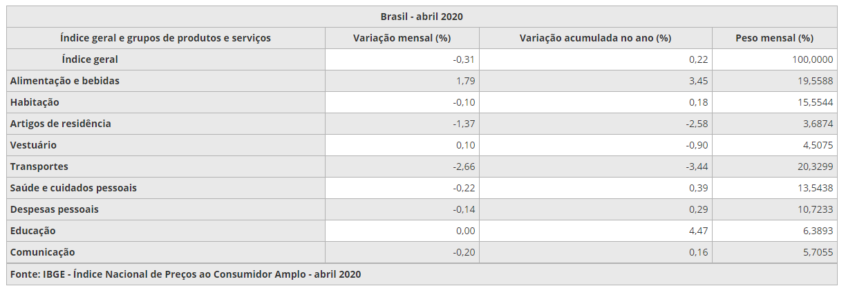 INSTITUTO BRASILEIRO DE GEOGRAFIA E ESTATÍSTICA. SIDRA. Página inicial. Disponível em: <https://sidra.ibge.gov.br/home/ipca/brasil>. Acesso em: 11 maio 2020.