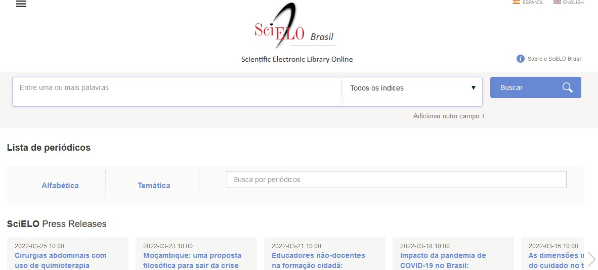 A SciELO é uma biblioteca digital de livre acesso que se baseia num modelo cooperativo de publicação digital de periódicos científicos brasileiros. Busca pelo o desenvolvimento de uma metodologia em comum para a preparação, armazenamento, disseminação e avaliação da produção científica no formato eletrônico. À medida do tempo vão sendo novos títulos de periódicos incorporados à coleção da biblioteca, desta forma, se mantém em constante atualização. Foi resultado de um projeto de pesquisa da Fundação de Amparo à Pesquisa de São Paulo (FAPESP), em parceria com a Centro Latino-Americano e do Caribe de Informação em Ciências da Saúde (BIREME). E desde 2002 conta com o apoio do Conselho Nacional de Desenvolvimento Científico e Tecnológico (CNPq).