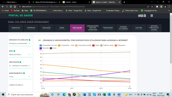 Por meio do Portal de dados do Cetic.br, é possível categorizar a pesquisa em TIC domicílios, kids on-line, empresas etc. há também filtros como unidade de análise, ano, indicador e agrupamento.